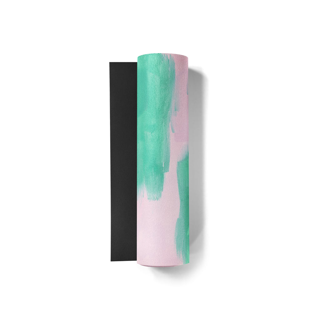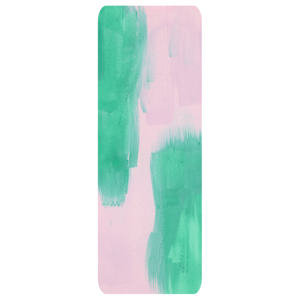 This yoga mat features a charming pink and aquamarine abstract painting by artist Erika Firm.