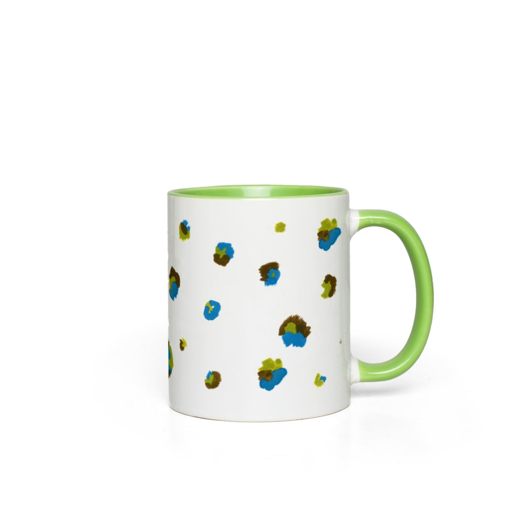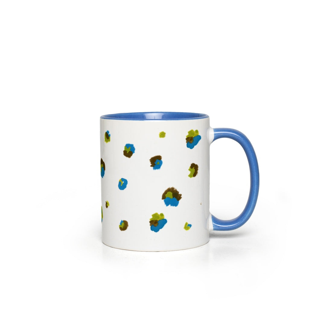 This coffee mug features a cobalt blue, olive green, and sienna brown leopard pattern painted by artist Erika Firm.
