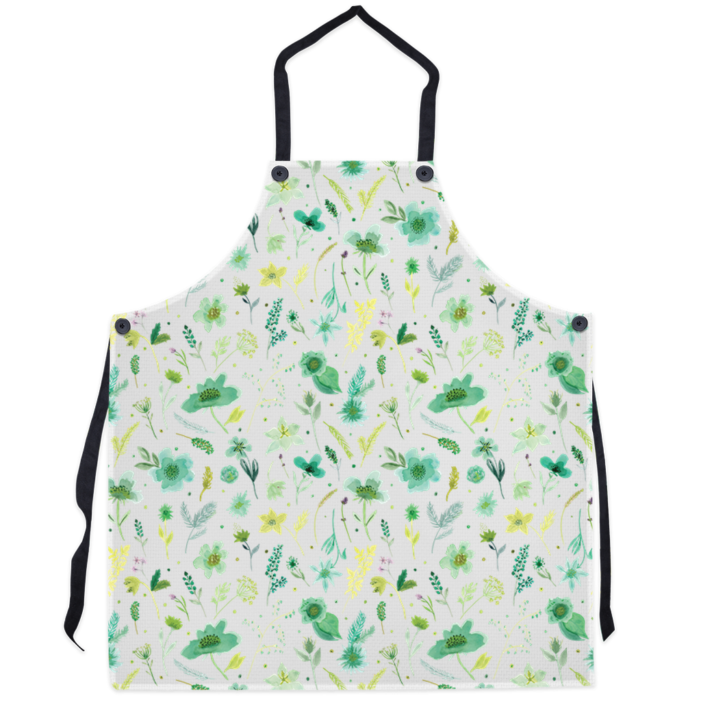 This kitchen apron features a vibrant green floral watercolor pattern by Erika Firm. The green floral pattern is inspired by the charming wildflowers and weeds in Erika's Johns Island, South Carolina backyard.