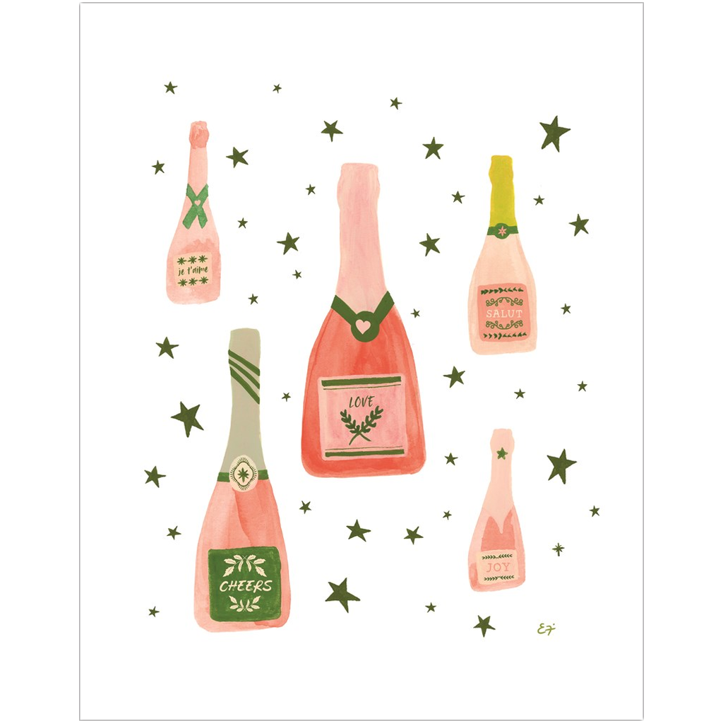 This art print features watercolor illustrations of pink champagne by artist Erika Firm.