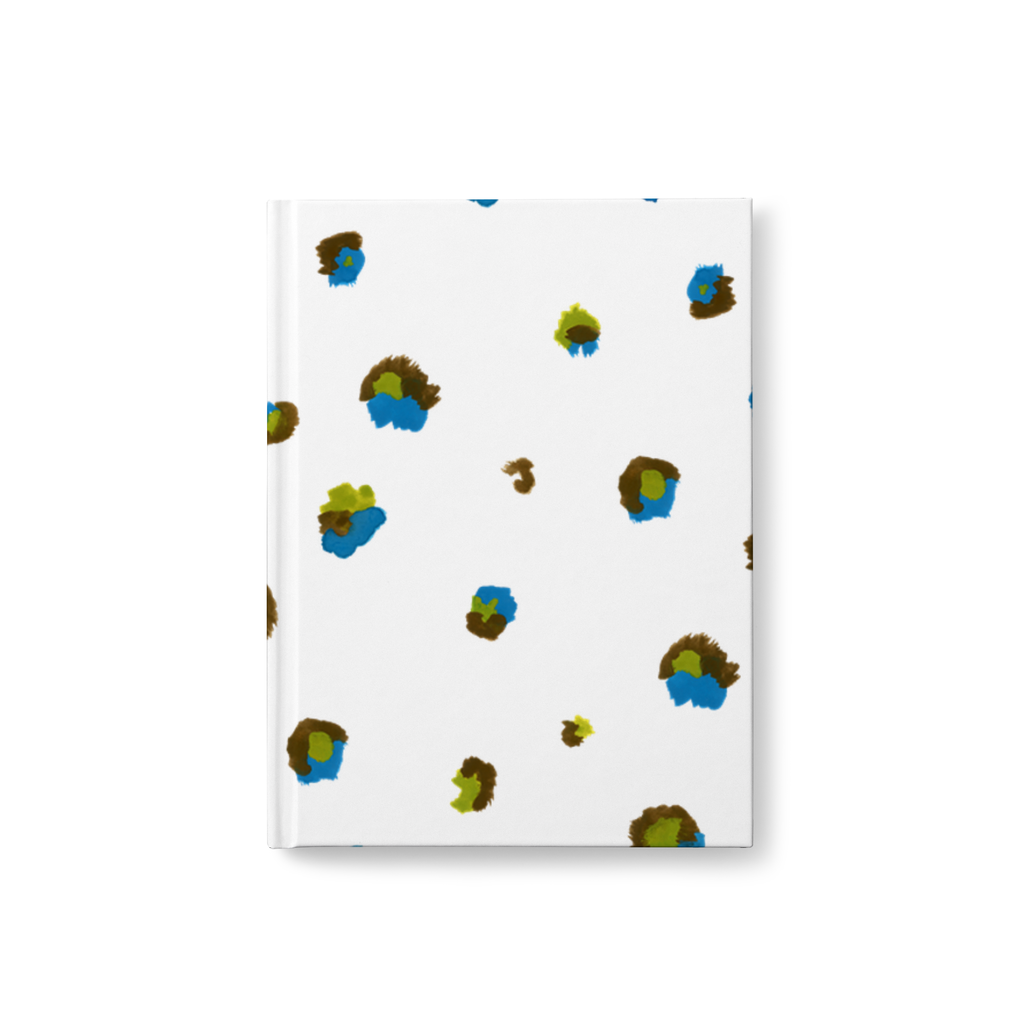 This notebook features a cobalt blue, olive green, and sienna brown leopard pattern painted by artist Erika Firm.