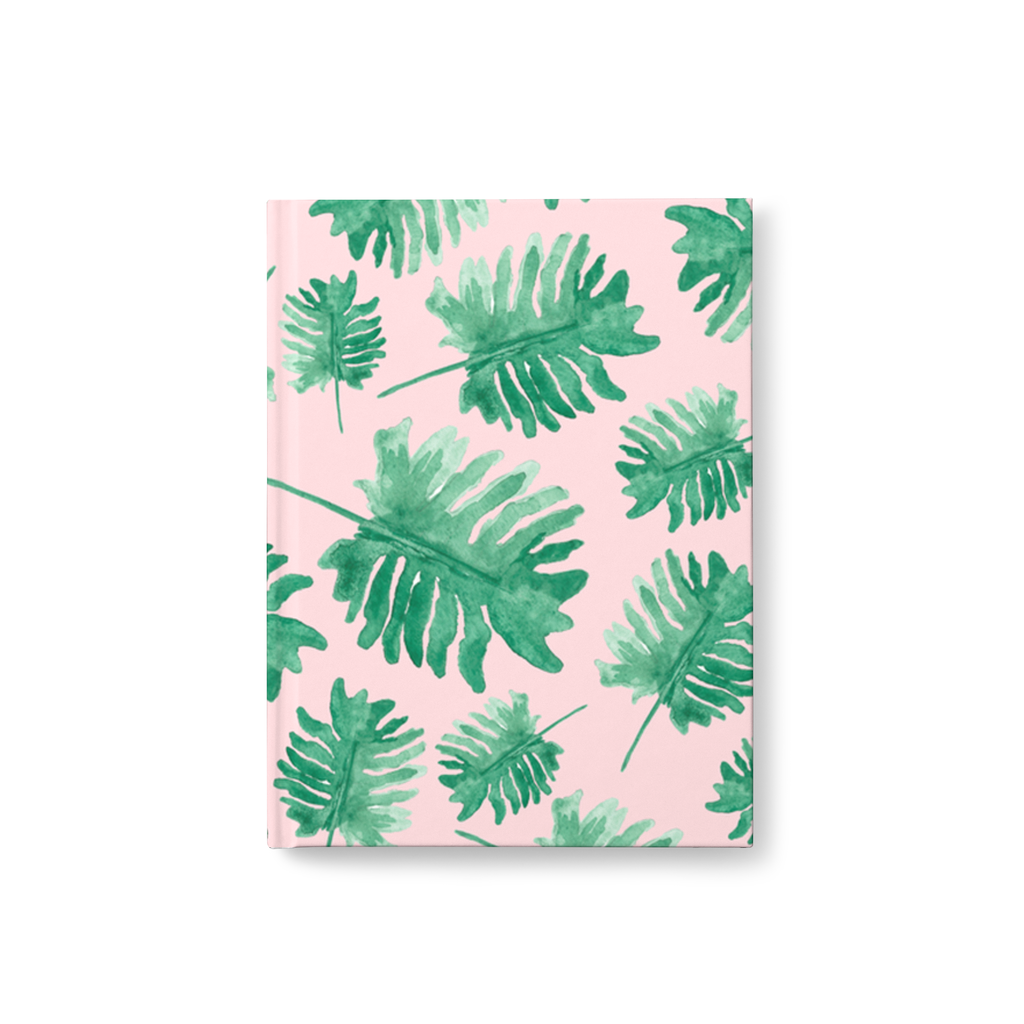 This hard bound journal features watercolor monstera leaves on blush pink background by South Carolina artist Erika Firm.
