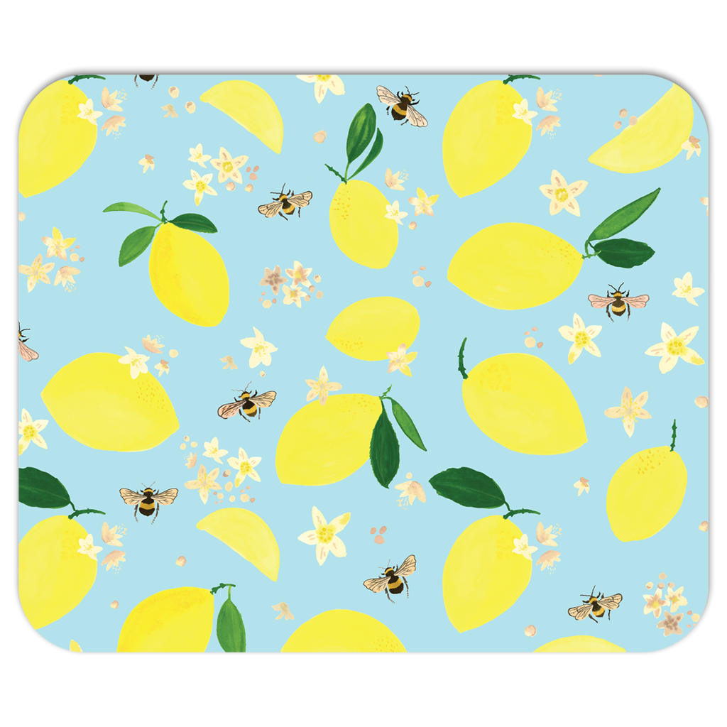 This mousepad features a charming lemons, lemon blossom and bumblebee pattern painted by artist Erika Firm.