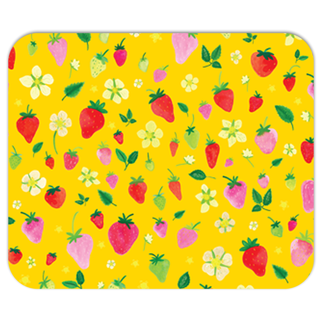 This mousepad features a charming red and pink strawberry watercolor pattern on a freesia yellow background painted by South Carolina artist Erika Firm.