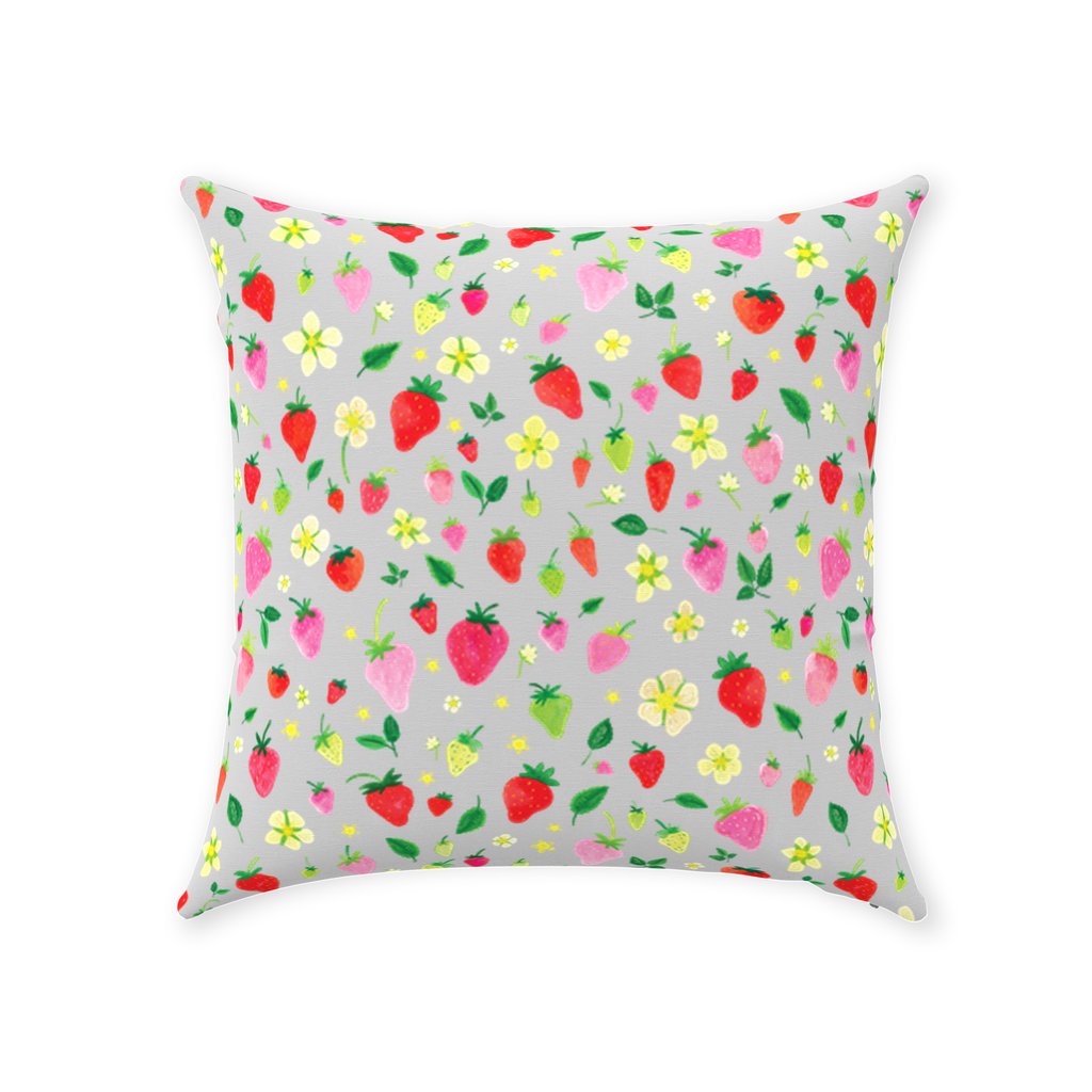 This cozy throw pillow features a darling red and pink strawberry watercolor pattern by South Carolina artist Erika Firm.