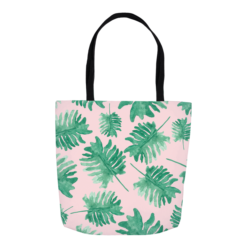 This tote bag features a watercolor monstera leaf pattern on blush pink background by South Carolina artist Erika Firm.