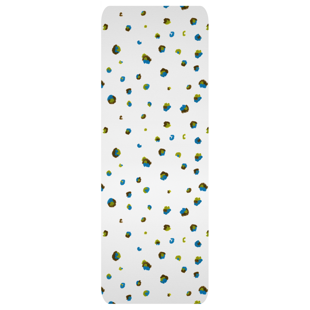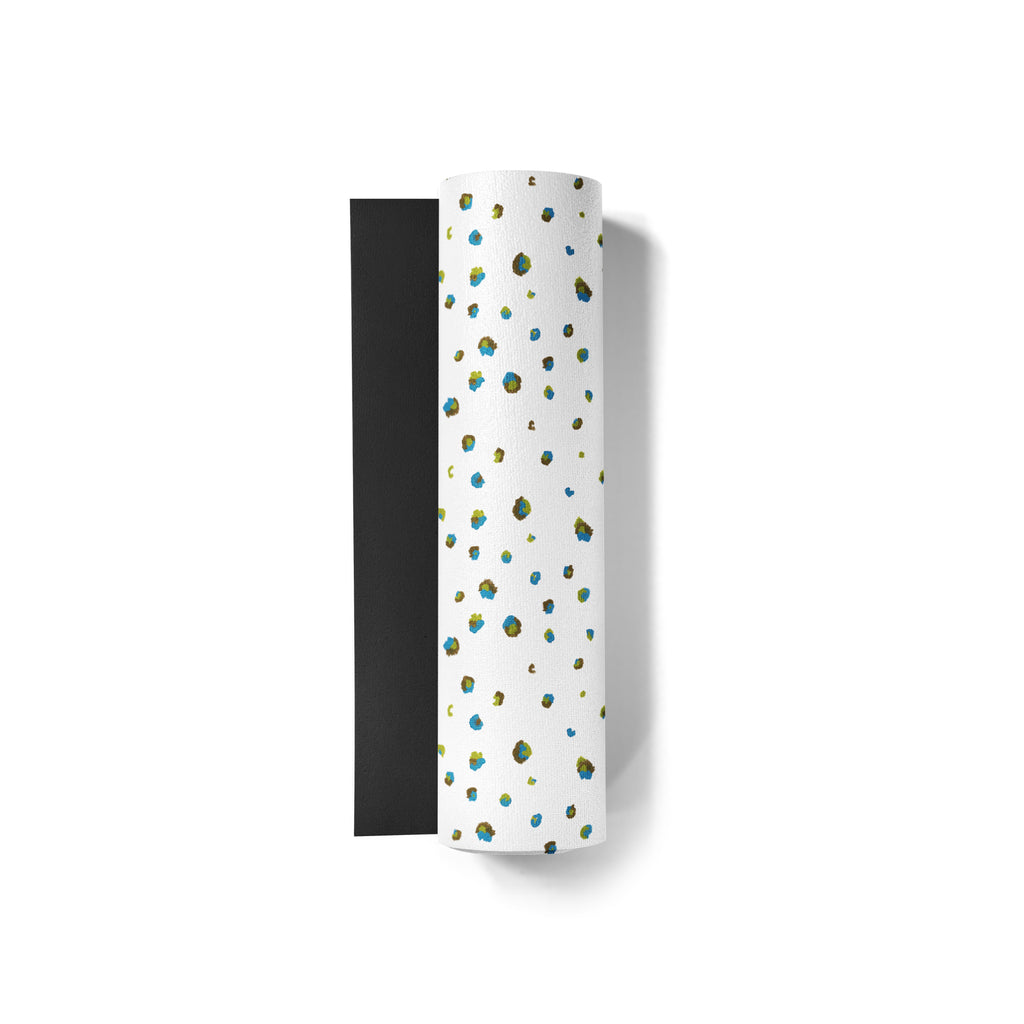 This yoga mat features a cobalt blue, olive green, and sienna brown leopard pattern painted by artist Erika Firm.