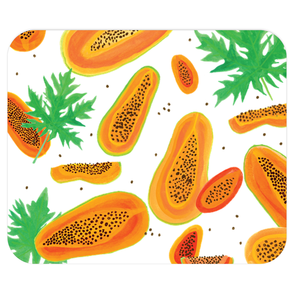 This colorful mousepad features a tropical papaya and papaya leaf watercolor pattern by artist Erika Firm.