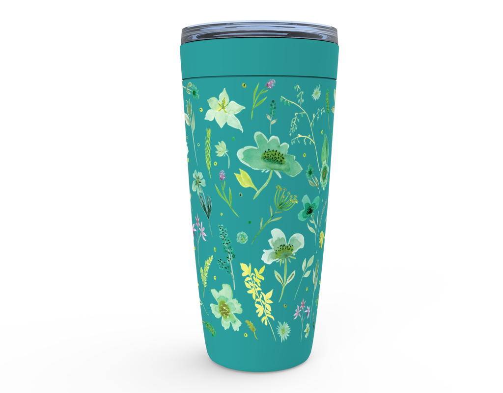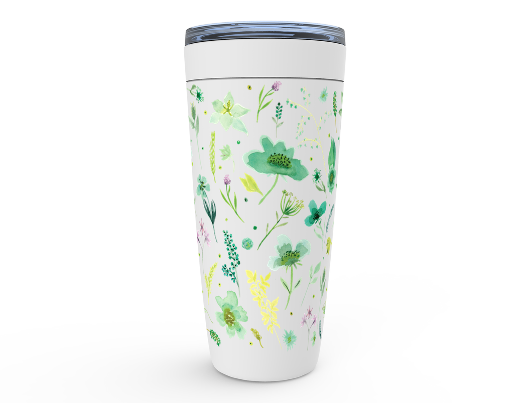 This travel mug features a vibrant green floral watercolor pattern by Erika Firm. The green floral pattern is inspired by the charming wildflowers and weeds in Erika's Johns Island, South Carolina backyard.