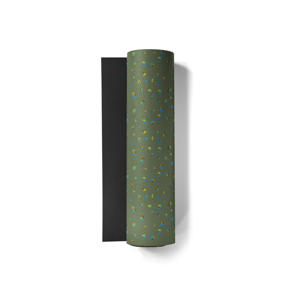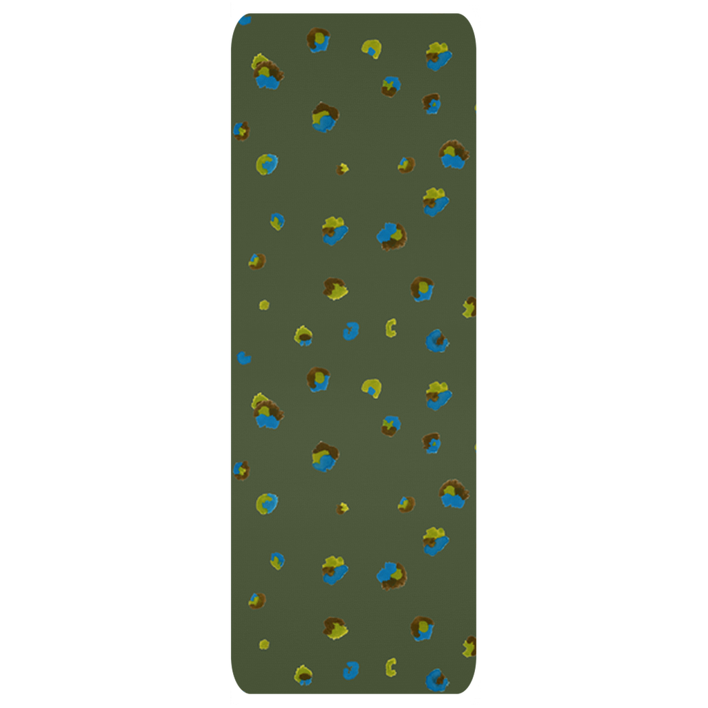 This yoga mat features a cobalt blue, olive green, and sienna brown leopard pattern on a dark green background painted by artist Erika Firm.