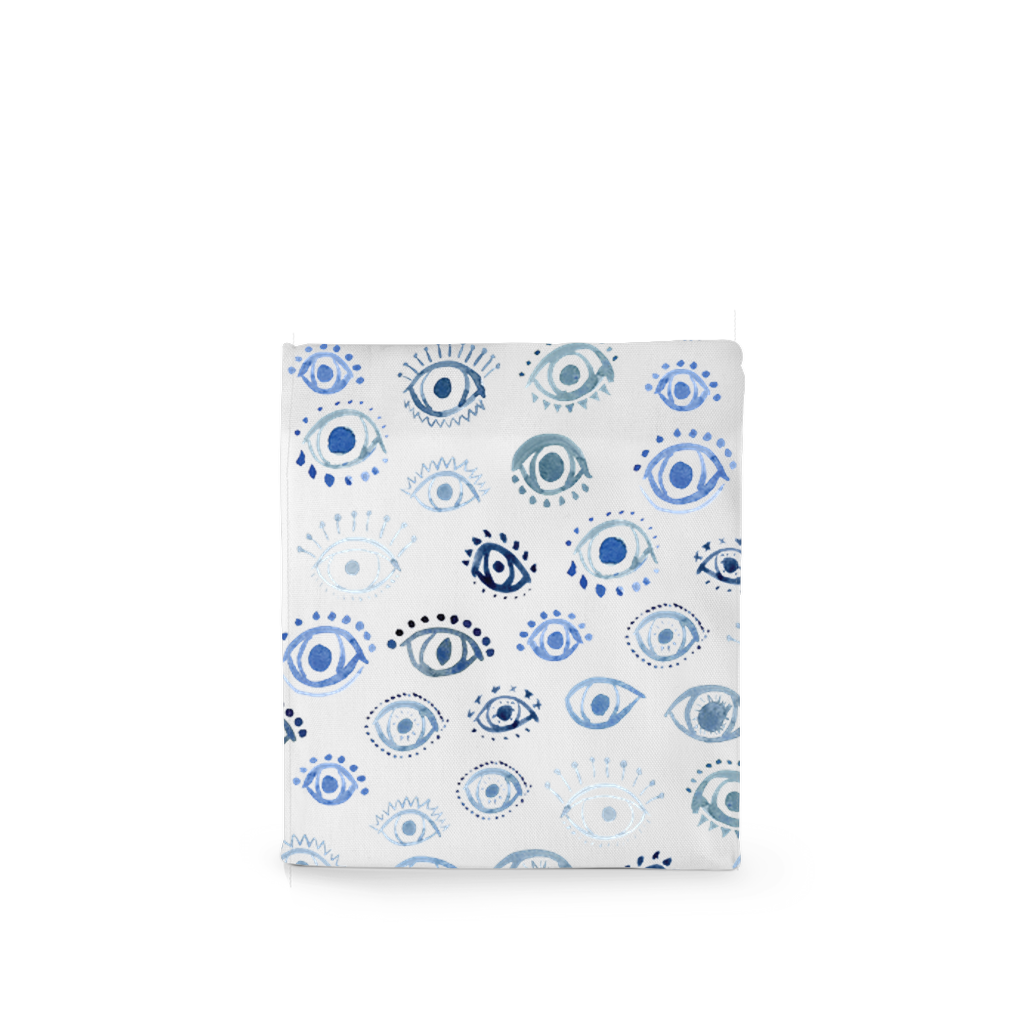 This reusable lunch bag features a blue and white evil eye watercolor illustration pattern by Erika Firm.