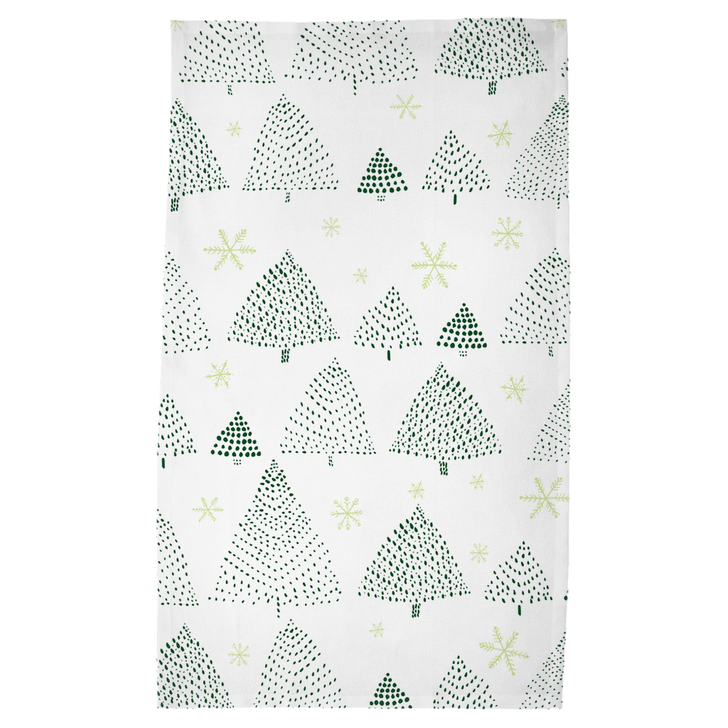 This festive holiday tea towel features green pine tree and snowflake illustrations on a white background. Art by Erika Firm.