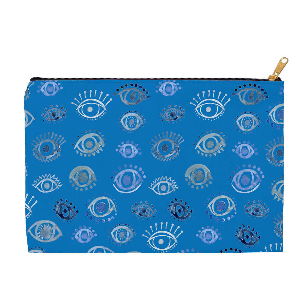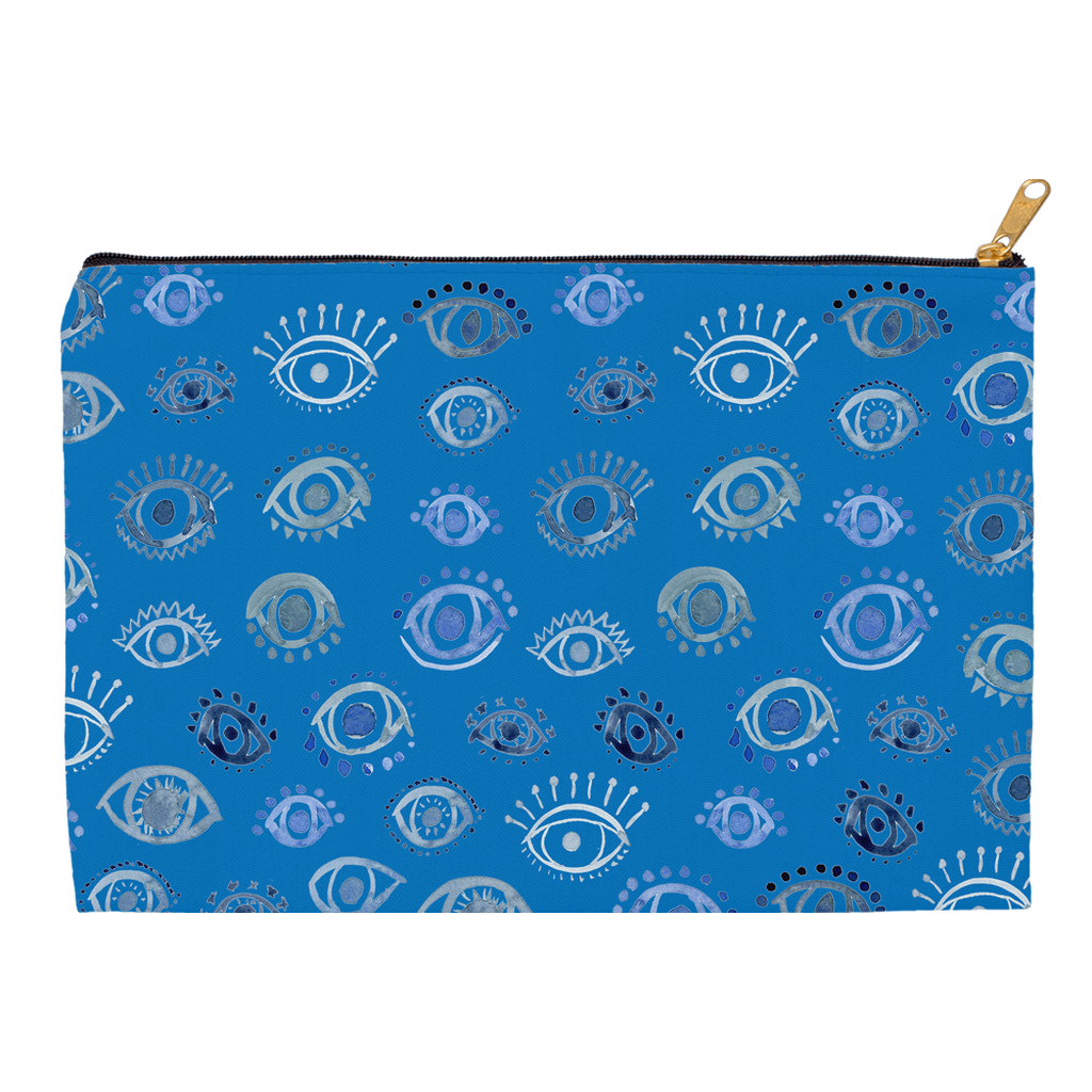 This cloth accessory pouch features lucky Greek Eye evil eyes pattern on Aegean Blue background by South Carolina artist Erika Firm.