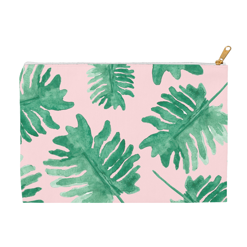 This cloth accessory pouch features a lovely watercolor painted Monstera leaf pattern on a blush pink background by South Carolina artist Erika Firm.