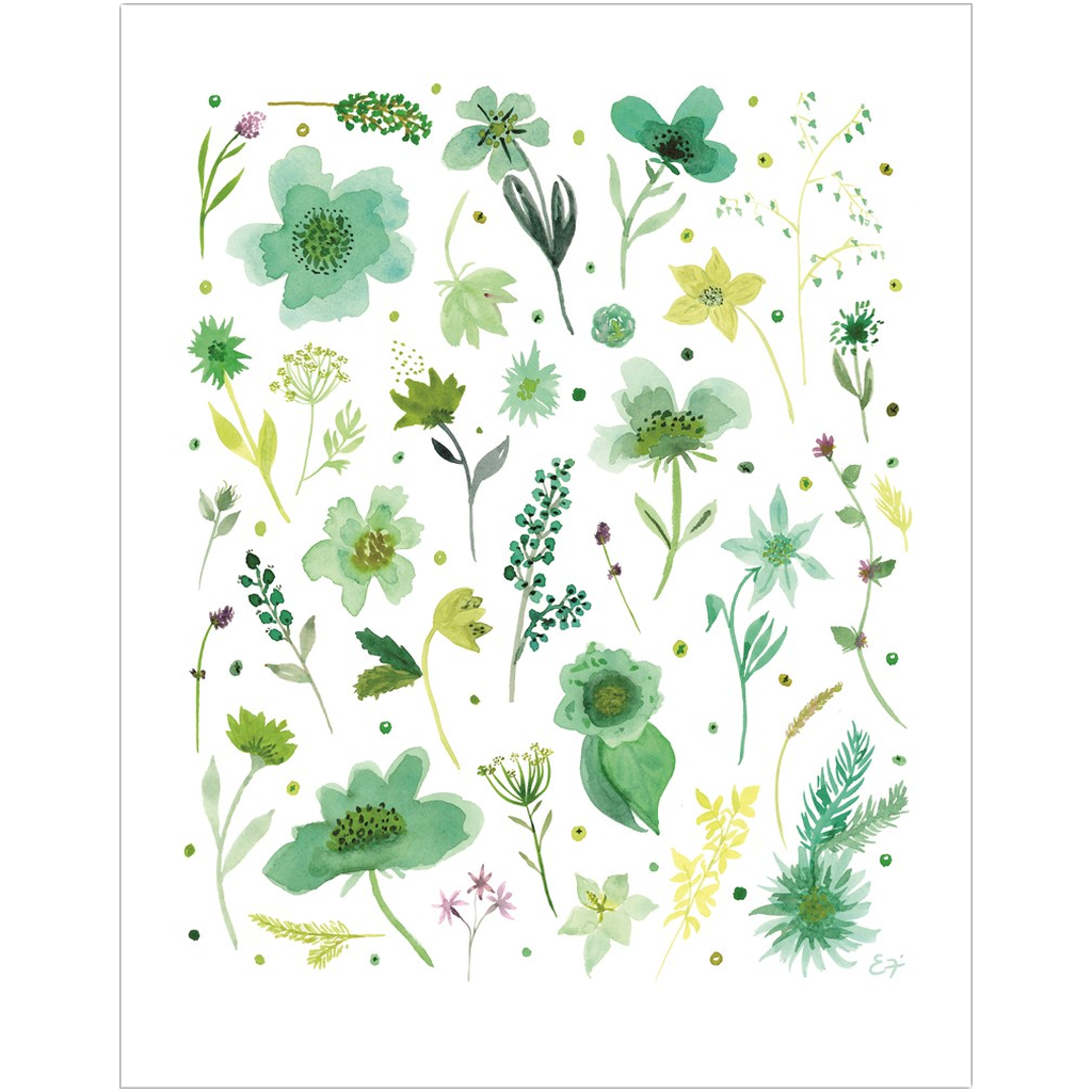 This verdant flowers art print features watercolor floral illustrations by South Carolina artist Erika Firm in her favorite colors: green and more green.