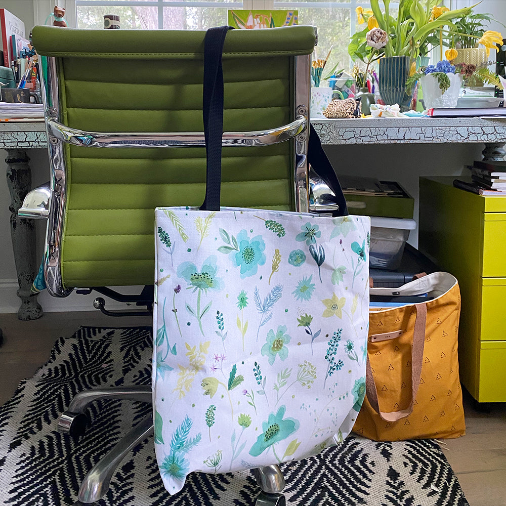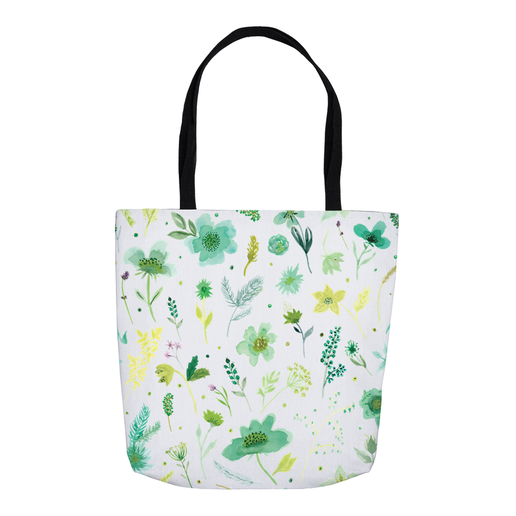 This tote bag features a vibrant green floral watercolor pattern by Erika Firm. The green floral pattern is inspired by the charming wildflowers and weeds in Erika's Johns Island, South Carolina backyard.
