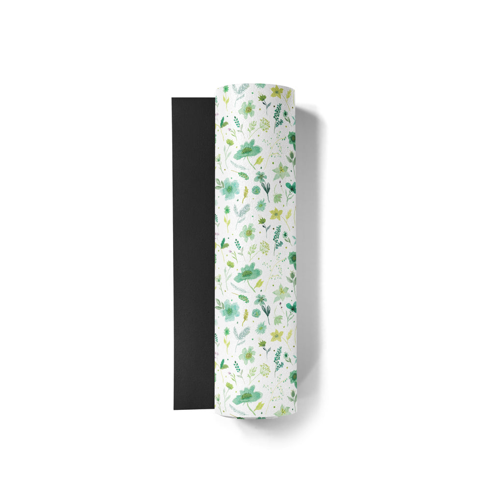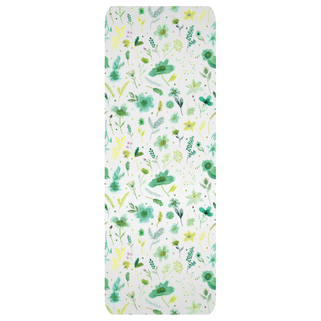 This yoga mat features a vibrant green floral watercolor pattern by Erika Firm. The green floral pattern is inspired by the charming wildflowers and weeds in Erika's Johns Island, South Carolina backyard.