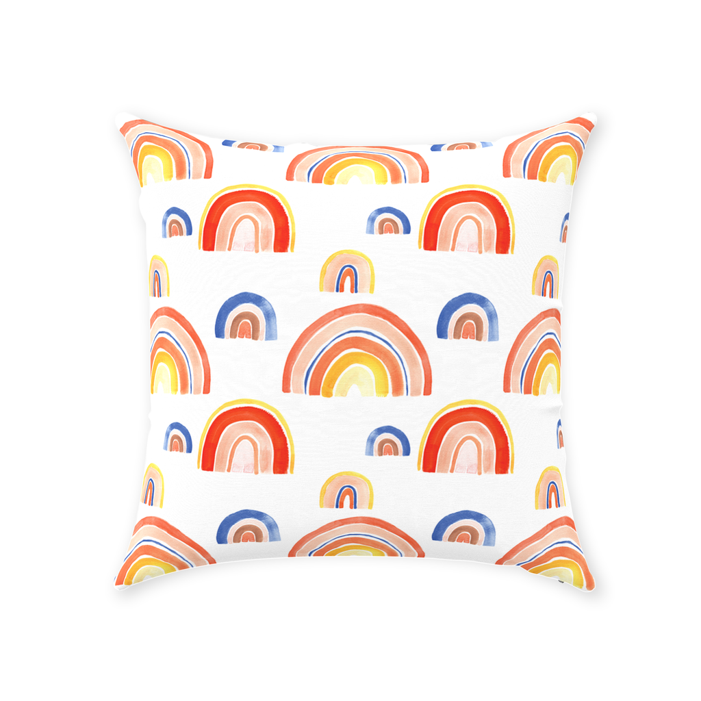 This cozy throw pillow features a charming muted rainbow watercolor pattern in desert inspired colors by South Carolina artist Erika Firm.