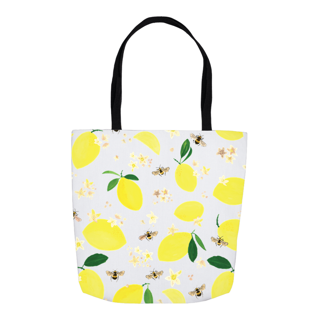 This lemon tote bag features watercolor illustrations of lemons, bumble bees and lemon blossoms by South Carolina artist Erika Firm.